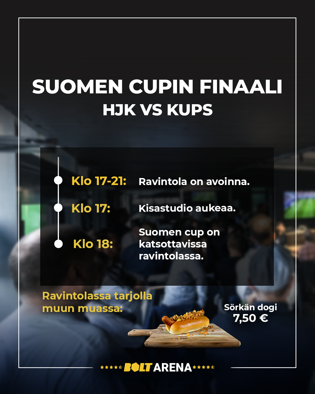 Mikäli Tampereen-reissu jää tekemättä, Bolt Arenan 1907 -ravintolassa järjestetään lauantai-iltana kisakatsomo, jonne voi saapua seuraamaan finaalia TV:n välityksellä. Ravintolan ovet aukeavat klo 17, tervetuloa!