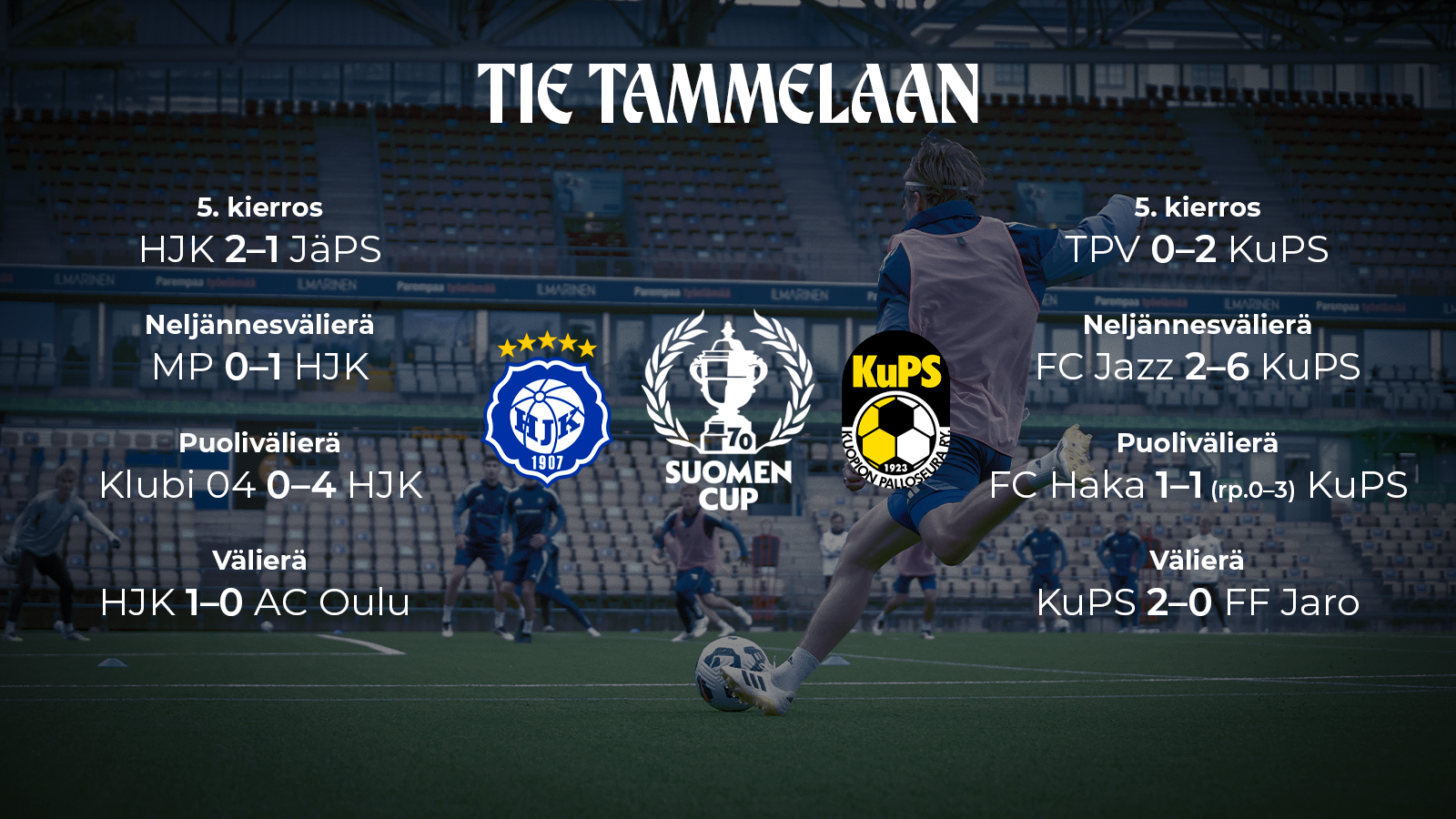 Jalkapallon Suomen Cupin 70-vuotisjuhlavuosi huipentuu lauantaina loppuotteluun Tammelan stadionilla Tampereella. HJK:n cup-junan päätepysäkillä vastaan asettuu turnauksen hallitseva mestari KuPS.