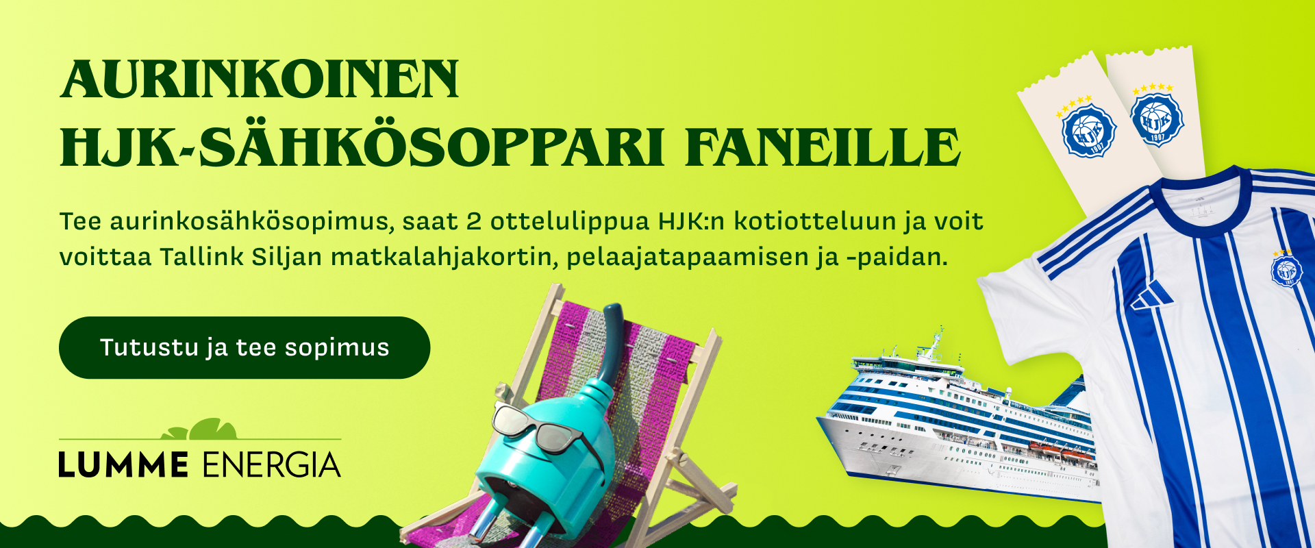 HJK ja Lumme Energia tarjoavat kaikille aurinkosähkösopimuksen tehneille 2 vapaalippua vapaavalintaiseen HJK:n kotiotteluun. Lisäksi sopimuksen tehneiden kesken arvotaan yksi 500€ arvoinen Tallink Siljan lahjakortti, pelaajatapaaminen ja pelipaita. Suosittelemme lämpimästi tutustumaan Lumme Energian tarjoamaan aurinkosähkötarjoukseen klubilaisille tästä linkistä.