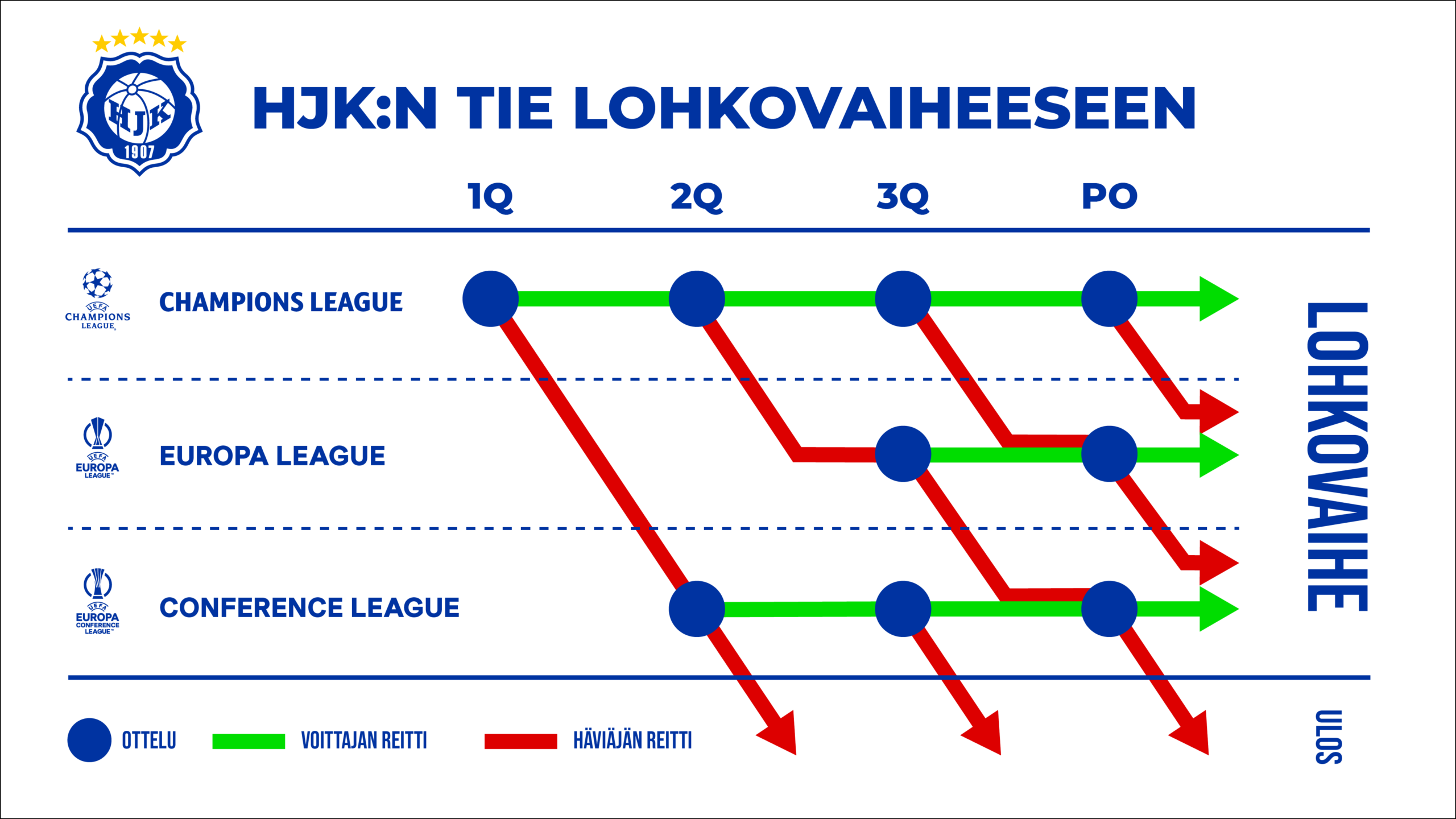 HJK:n europelitaival alkaa kuluvan kesän osalta keskiviikkoiltana, kun sinivalkoiset isännöivät pohjoisirlantilaista Larnea Mestarien liigan ensimmäisen karsintakierroksen ensimmäisessä osaottelussa. Toinen osa pelataan ensi viikon keskiviikkona Pohjois-Irlannissa.