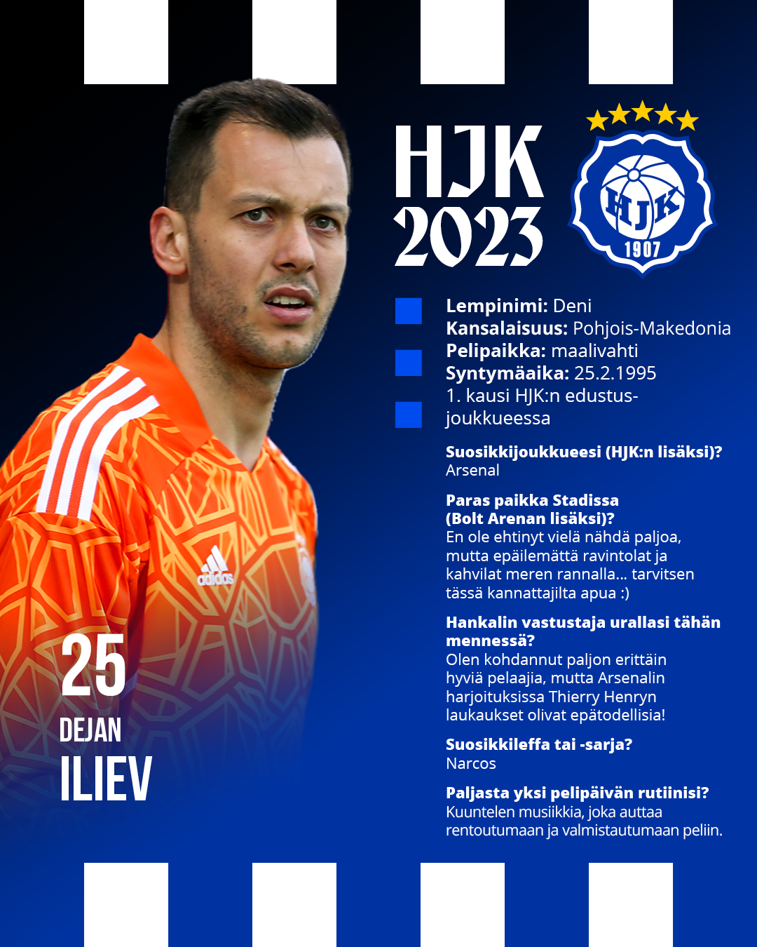 HJK haluaa viime kauden tapaan tehdä pelaajiaan tutummiksi katsojille. Julkaisemme jokaisesta pelaajasta, tällä kertaa pohjoismakedonialaisesta maalivahdista Dejan Ilievistä, katsauksen aiempaan uraan sekä pelaajan elämään syvemmin pureutuvan haastattelun.