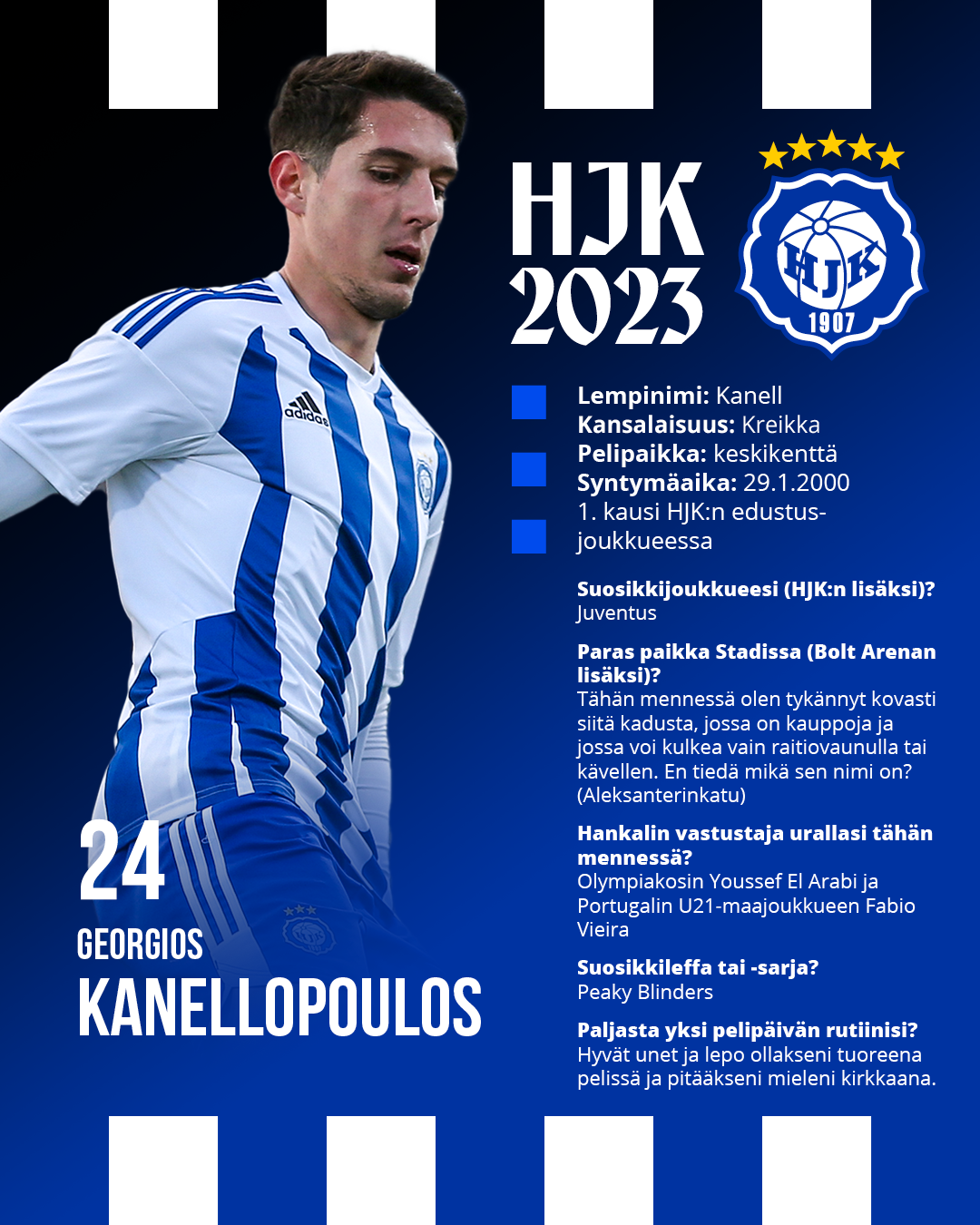 HJK haluaa viime kauden tapaan tehdä pelaajiaan tutummiksi katsojille. Julkaisemme jokaisesta pelaajasta, tällä kertaa Georgios Kanellopouloksesta, katsauksen aiempaan uraan sekä pelaajan elämään syvemmin pureutuvan haastattelun.